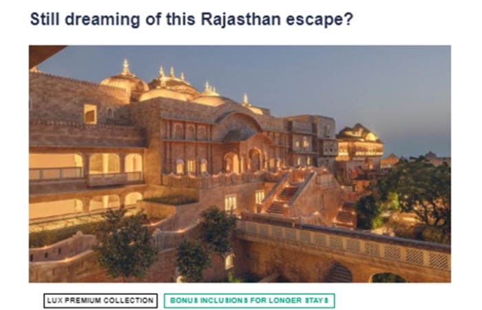 Let’s check an intelligent example that shows how personalization in Digital Marketing works. The screenshot below shows how a travel company, “Luxury Escapes,” sends an email to the user based on the locations searched for by the user on the website. The company sends a mail asking if the user is still dreaming of Rajasthan and encourages them to purchase a travel package to Rajasthan. This type of personalization helps to engage customers and increase sales.